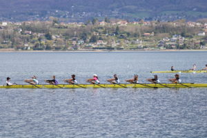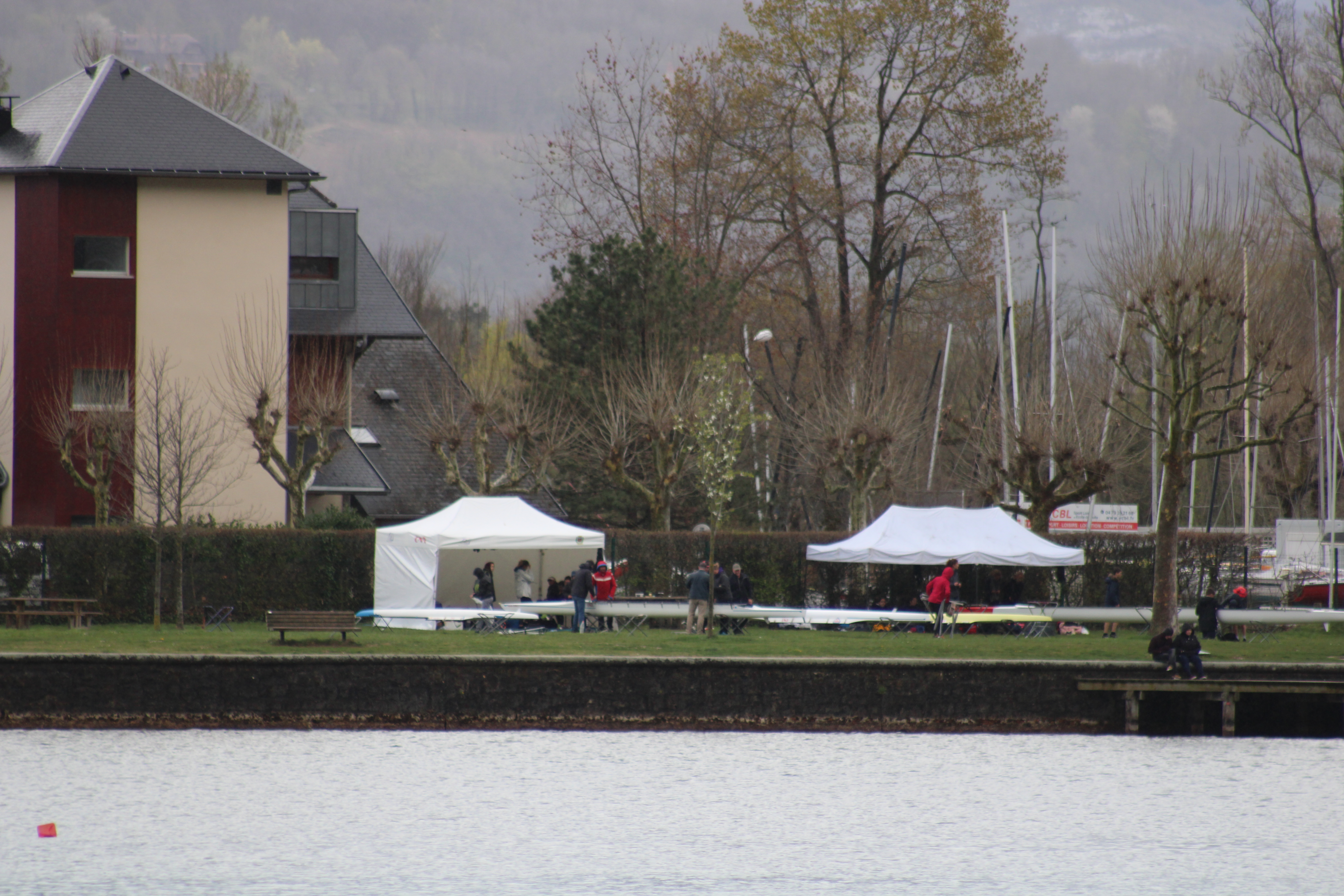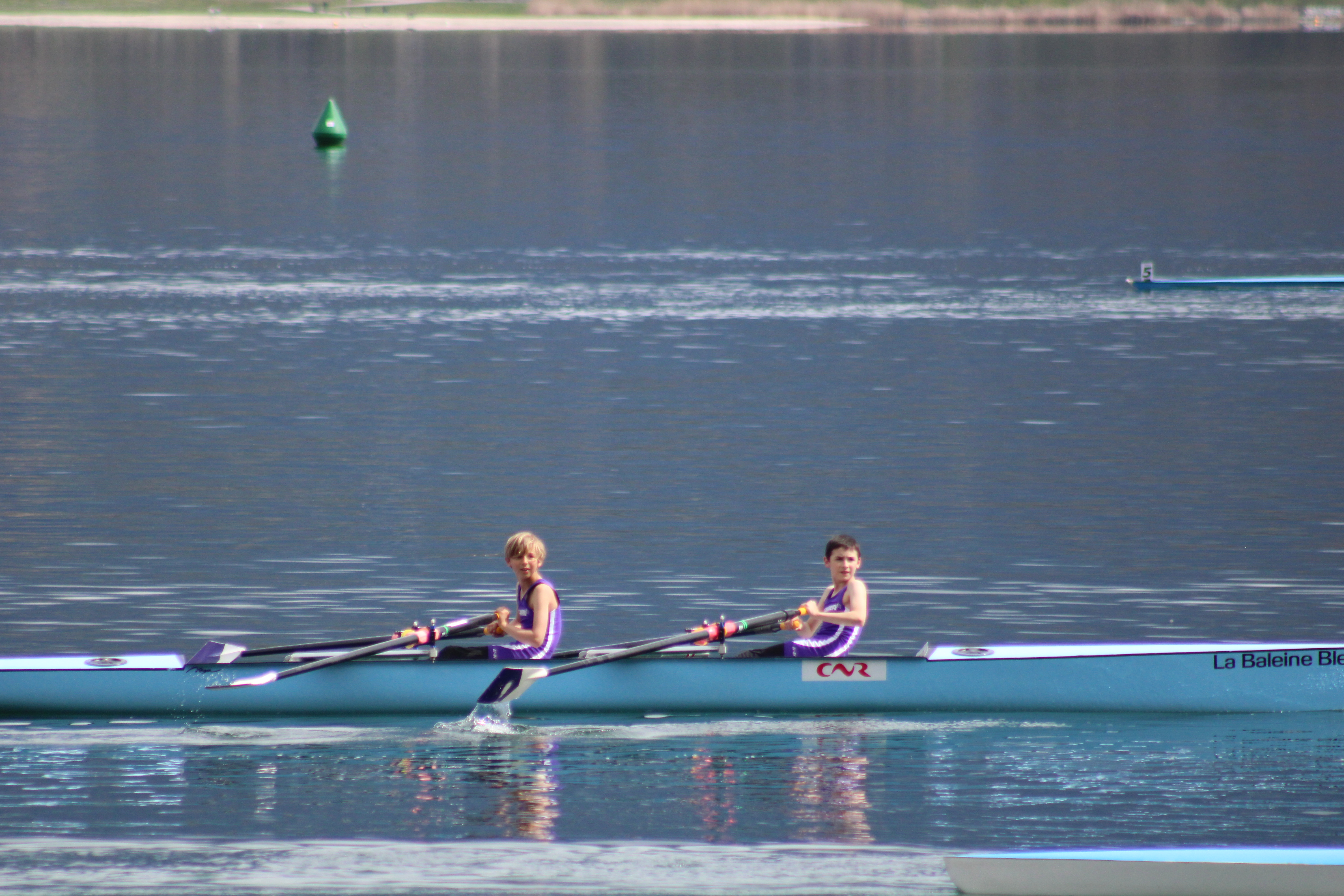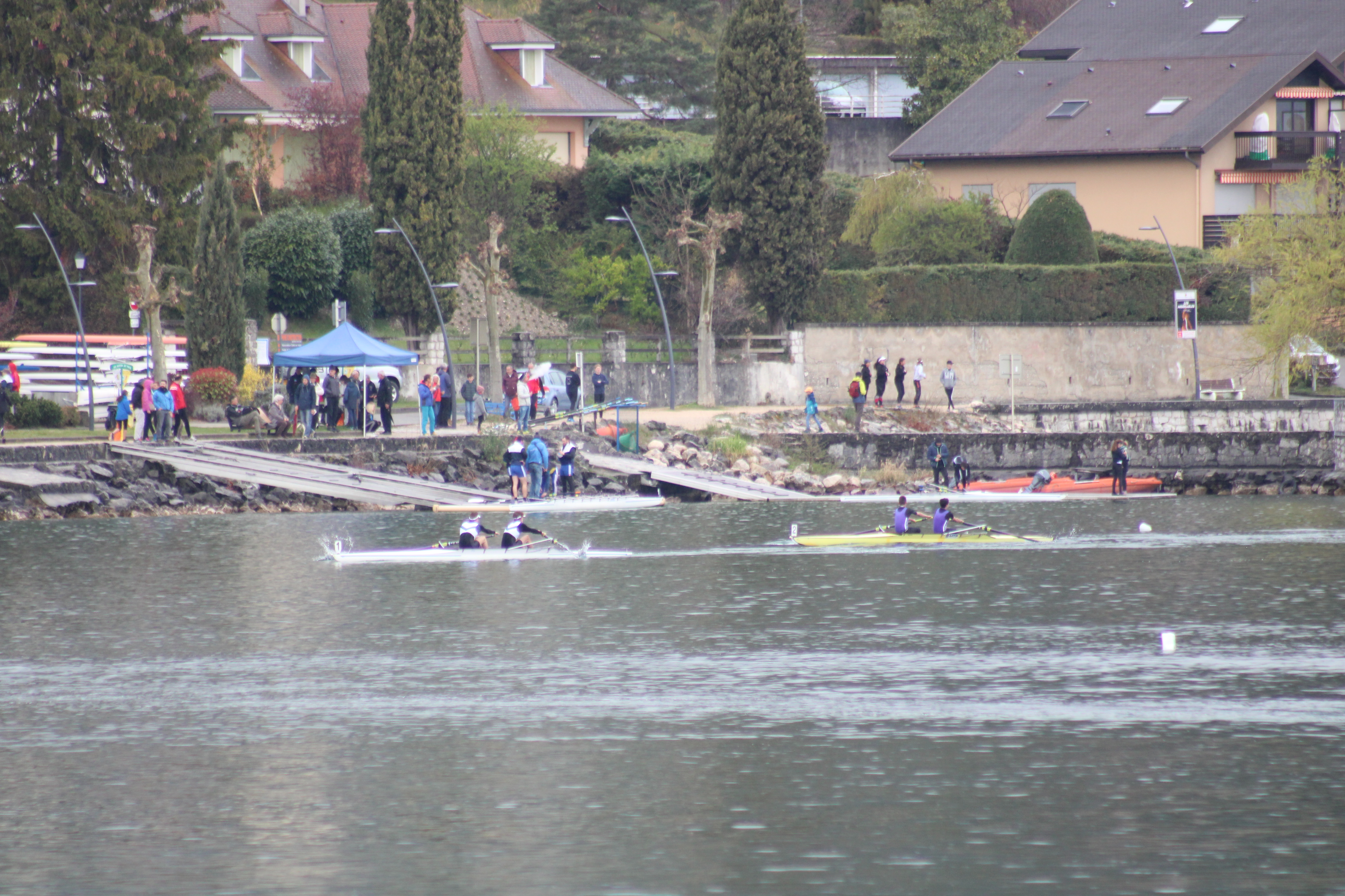 Après un changement de roue sur l’autoroute mais avec un »super papa » bien équipé nous sommes arrivés juste à l’heure pour les courses, la météo fut clémente seulement entre 11h et 15h, le reste de la journée la pluie a pris le dessus. De belles courses pour tous nos jeunes et moins jeunes rameurs.